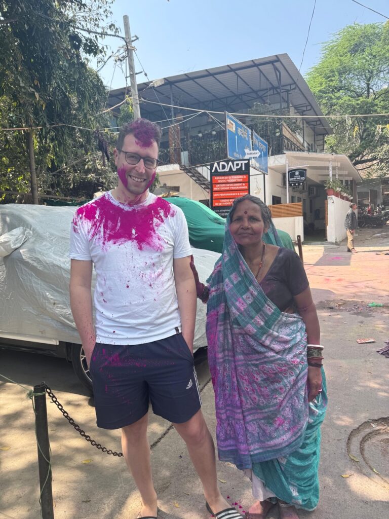 An einem Kreisverkehr angekommen konnten wir die ersten Aktionen des Holi-Fests beobachten. Mitten auf der Straße wurde ein Lagerfeuer entzündet. Dort konnten Strohpuppen eingeworfen werden, die die Dämonin Holika symbolisieren. Im Anschluss begannen sich schon einige Teilnehmende mit Farbe zu verzieren.